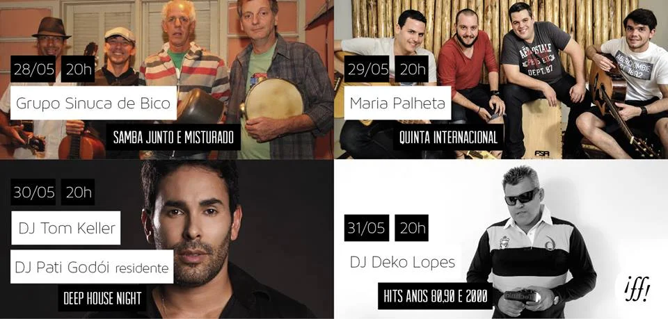 Programação semana 28 de maio 2014 IFF! Bar Vitória Hotel May 26, 2014 Amigos, Temos a progrmação de eventos do IFF! Bar aqui no site desta semana, confiram!